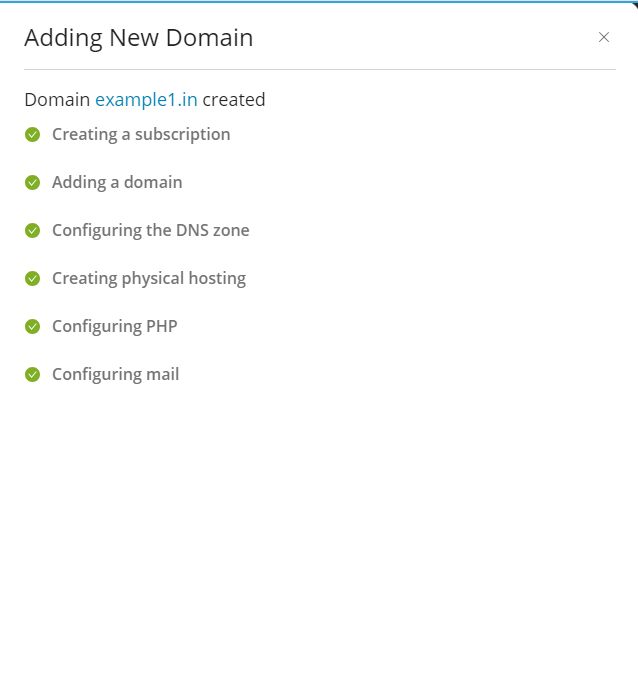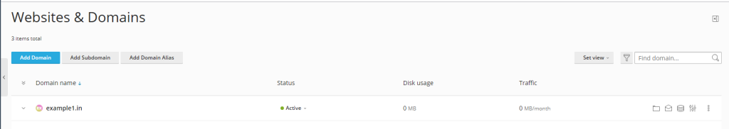 Once the process is complete, you should see the new domain listed under “Websites & Domains.” You can now manage this domain’s hosting settings, files, databases, email accounts, and other configurations from the Plesk control panel.