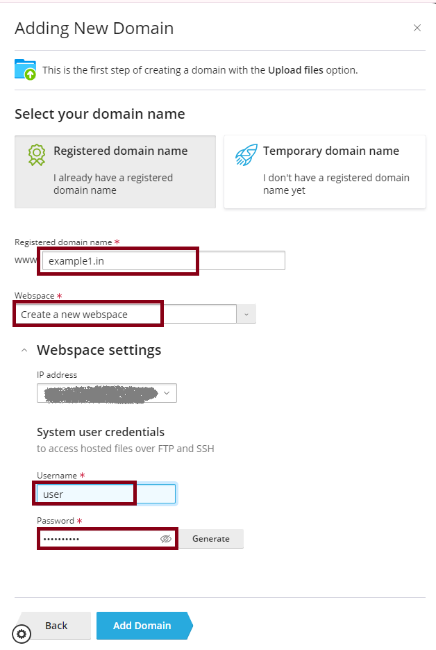 - Username: Set the FTP/SSH username for accessing the domain’s files.
